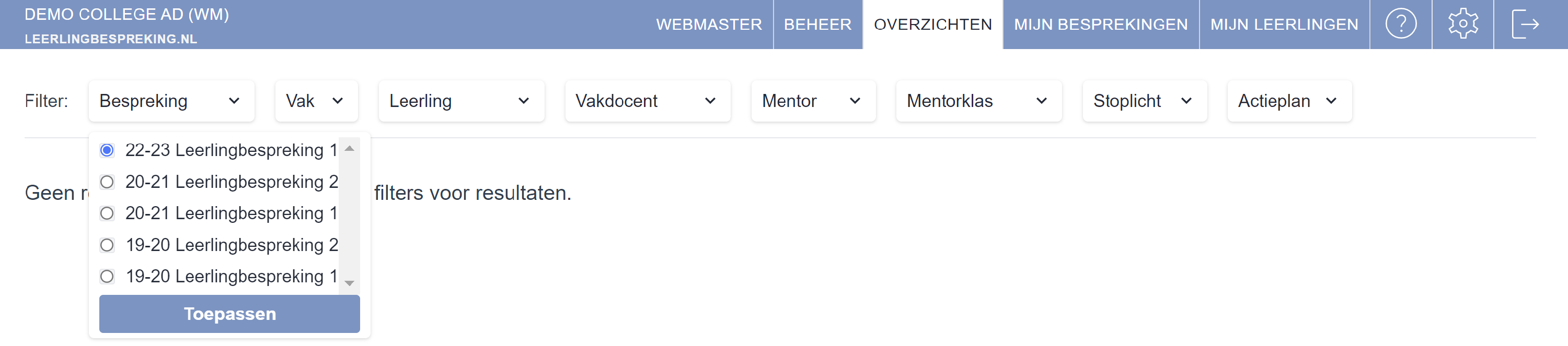 Vink bij Filter Bespreking de desbetreffende bespreking aan en klik op Toepassen.