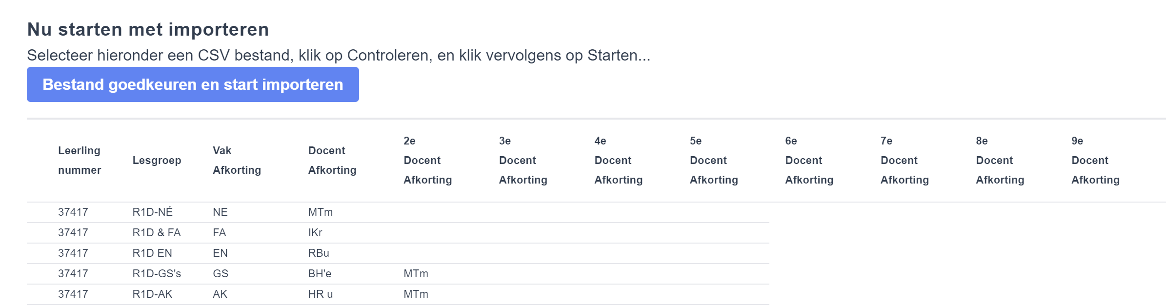 Als jouw school 500 leerlingen heeft en elke leerling heeft gemiddeld 10 vakken, dan zou deze import moeten bestaan uit ongeveer 5.000 regels.