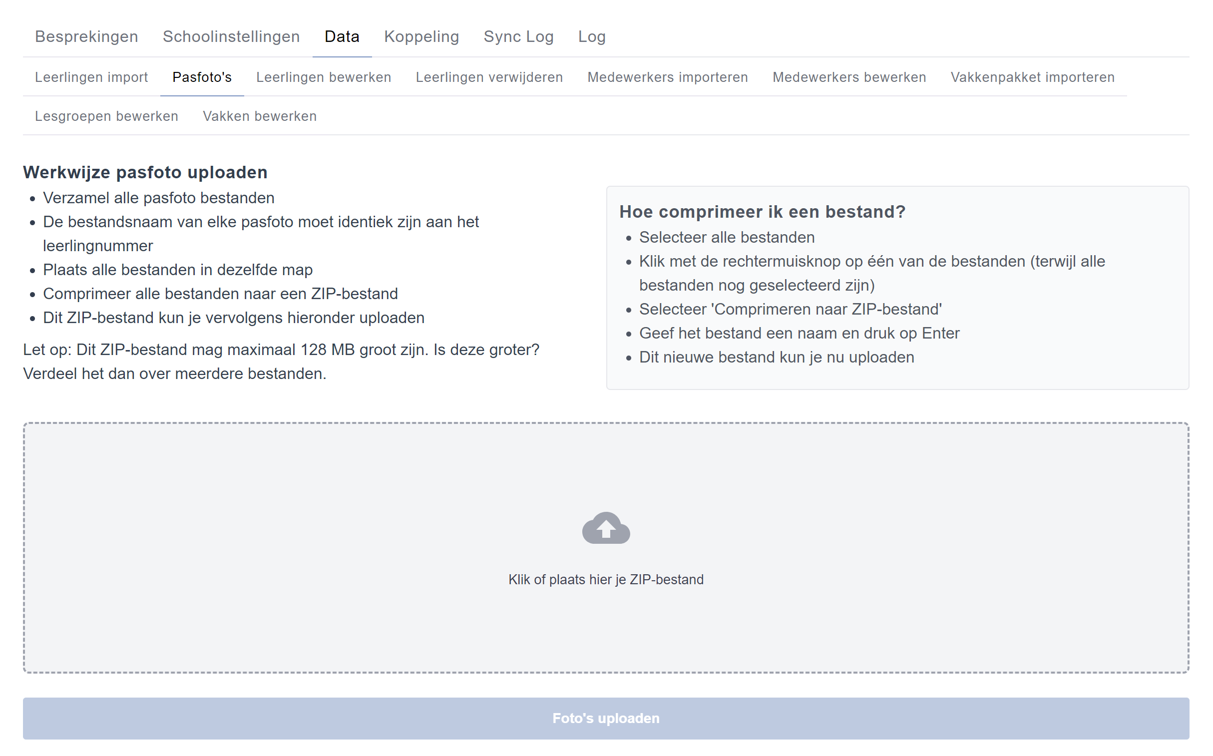 Ga naar Beheer > Data beheren > Leerling pasfoto´s.