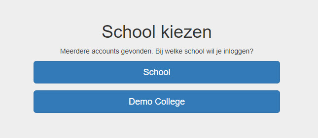 Hebben docenten slechts één inlog die ze gebruiken op alle vestigingen? Dan ziet de tool dat de docent toegang heeft tot meerdere school-accounts, en kan de docent bij het inloggen kiezen in welk school-account er ingelogd moet worden. Zie ook de afbeelding hieronder met het keuze-scherm: