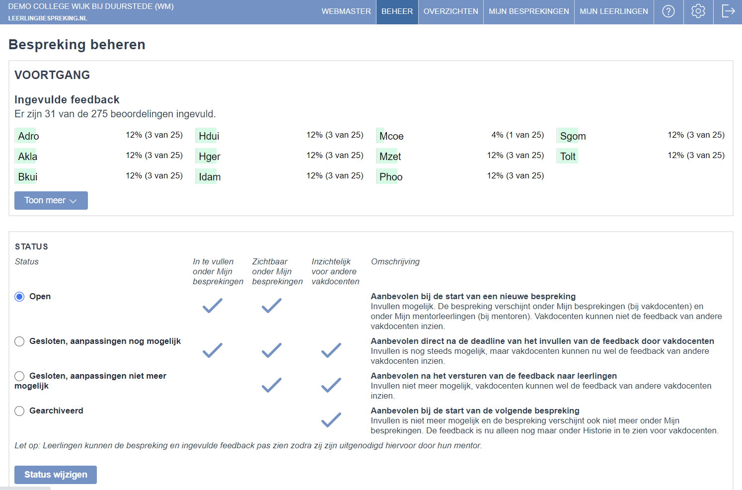 De bespreking is zichtbaar onder Mijn besprekingen (bij vakdocenten) en onder Mijn leerlingen (bij mentoren). Vakdocenten kunnen wel de feedback van andere vakdocenten inzien door op een leerling te klikken. Het is nog mogelijk om aanpassingen te doen.