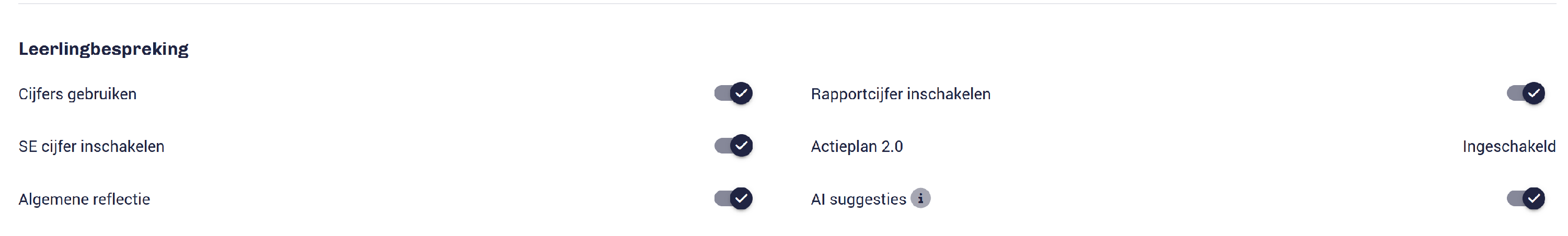 Bij Leerlingbespreking kun je instellen of je cijfers wilt gebruiken, rapportcijfers wil inschakelen en SE cijfers wilt inschakelen. Deze opties staan standaard uit, maar door op het vinkje te klikken gaan deze aan, en zullen cijfers ook elke nacht gesynct worden.
