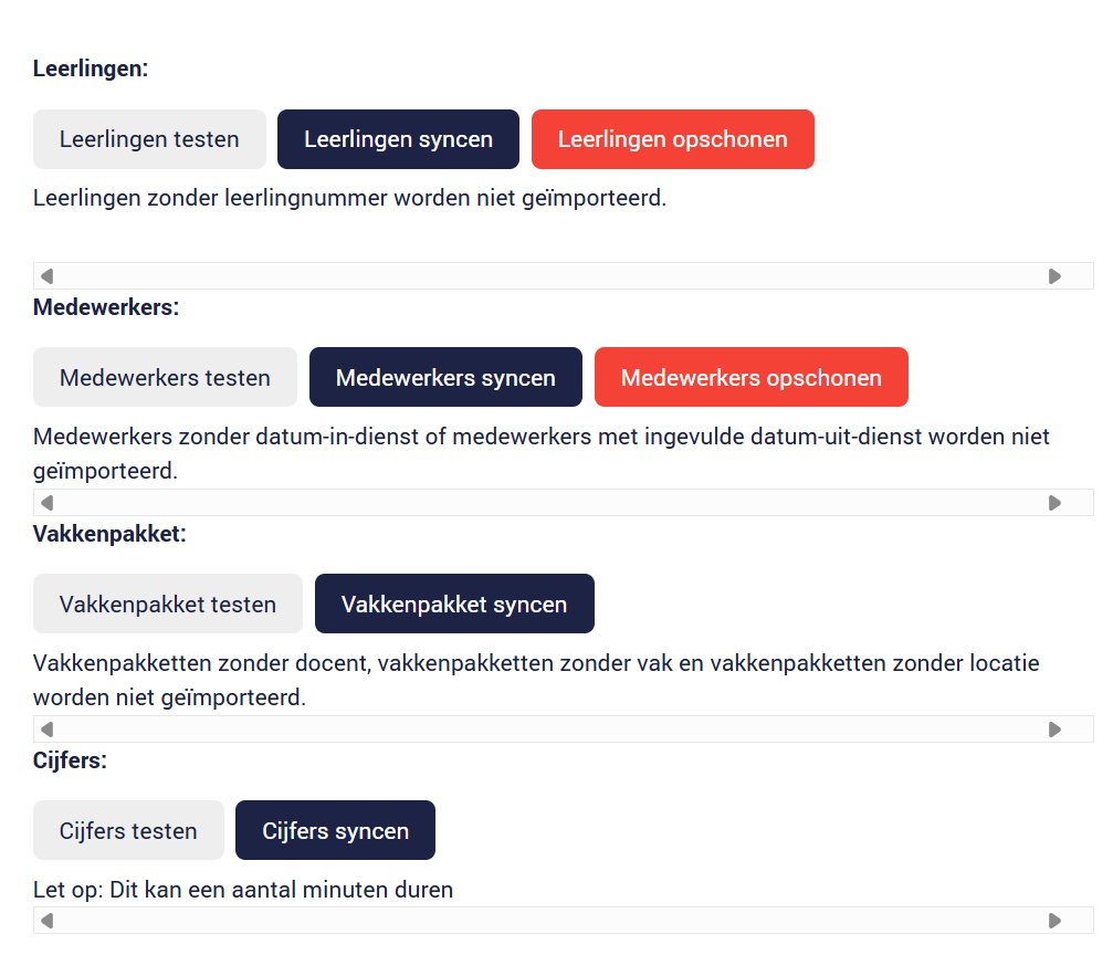 Als er data is gewijzigd in Magister en dit direct moet worden doorgevoerd in de tool, gebruik dan de blauwe knoppen (... syncen) onder Beheer > Koppeling beheren.