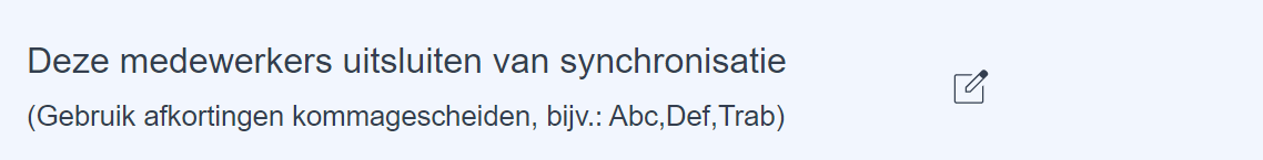 Hier kun je de afkortingen invullen van medewerkers die niet hoeven te worden gesynchroniseerd. Let op dat je kommagescheiden, zonder spatie de afkortingen invoert. Deze zijn hoofdlettergevoelig, dus exact overnemen zoals ze in de tool staan!